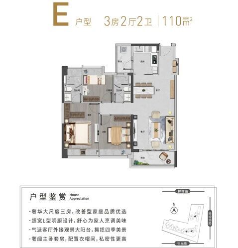 110㎡三房两卫户型,总价约440万元,适合注重居住舒适度的刚需家庭。该户型空间更大,格局更合理,客厅宽敞明亮,连接超大阳台,拓展了室内空间;三个卧室均朝南,空间宽敞,主卧配备独立卫生间和衣帽间,私密性和舒适度更高;厨房采用U型设计,操作空间大,方便家人做饭;卫生间干湿分离,设计合理,使用起来十分便捷。